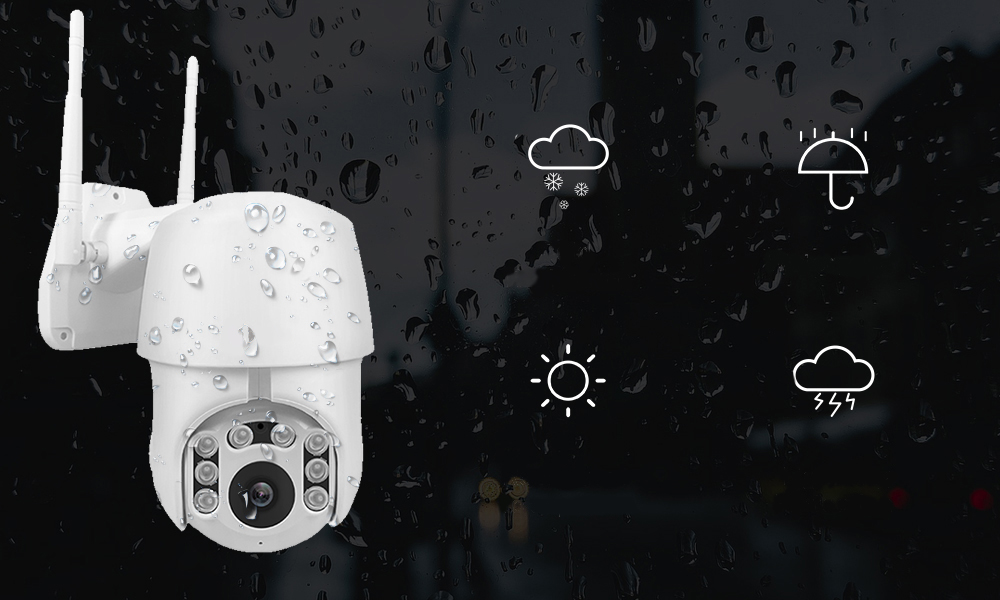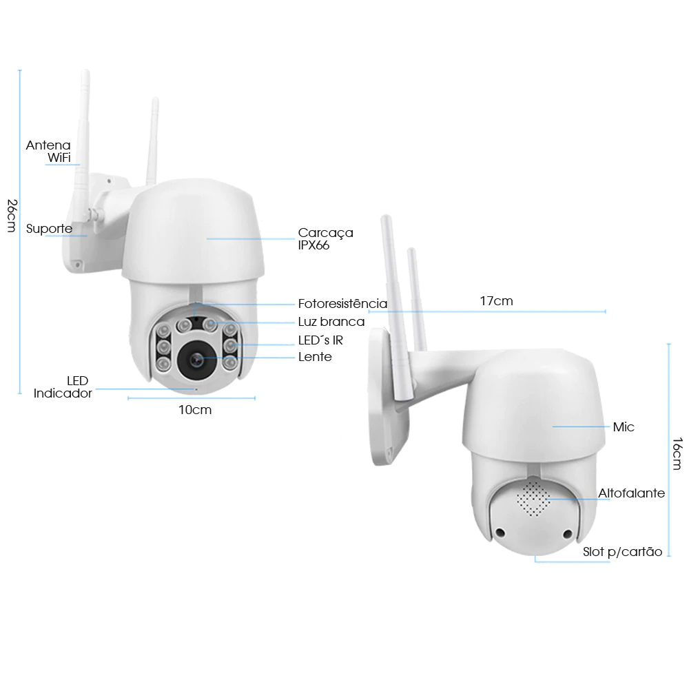 Resistente à intempérie / 6 Luzes IR / Luzes duplas / Rastreamento automático / Suporta protocolo Onvif / Notificação de alarme