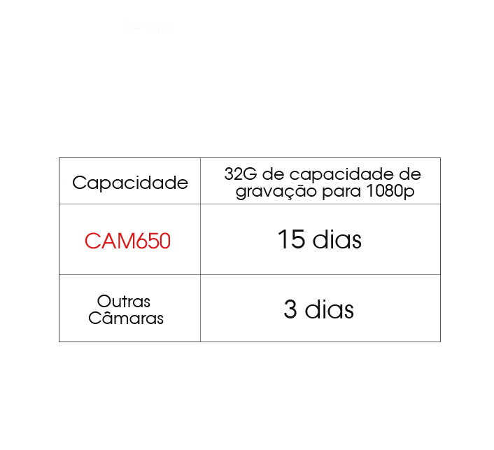 Modo de gravação: Modo normal (4 dias de vídeo podem ser gravados com cartão SD de 32GB); Modo superior (10 dias de vídeo podem ser gravados com cartão SD de 32GB); Modo avançado (15 dias de vídeo podem ser gravados com cartão SD de 32GB)